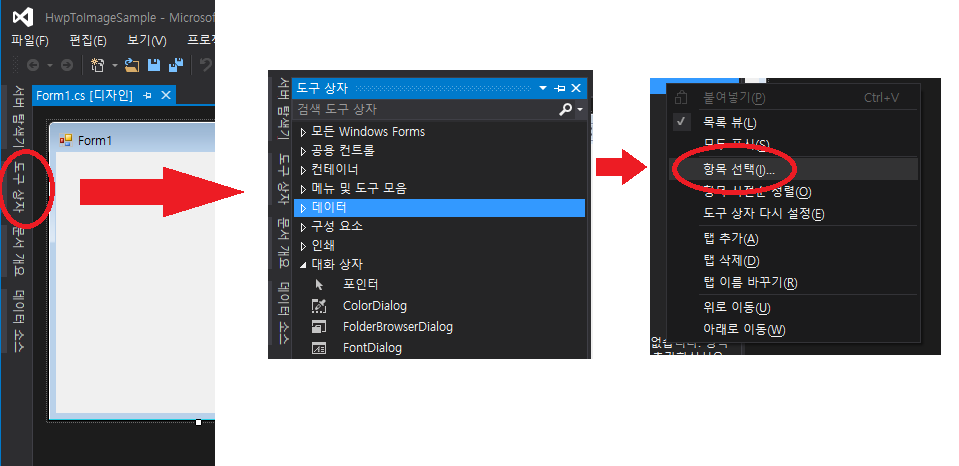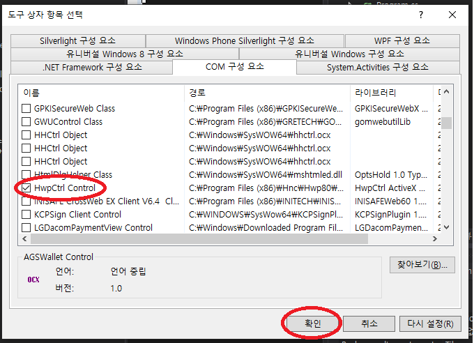 앞서 말씀드렸듯이 저는 WinForm에 익숙하지 않기 때문에 [COM 구성 요소]에 있는 한글 Control을 추가하는 방법은 여러가지가 있을 수 있지만 제가 하는 방식을 사용하겠습니다.